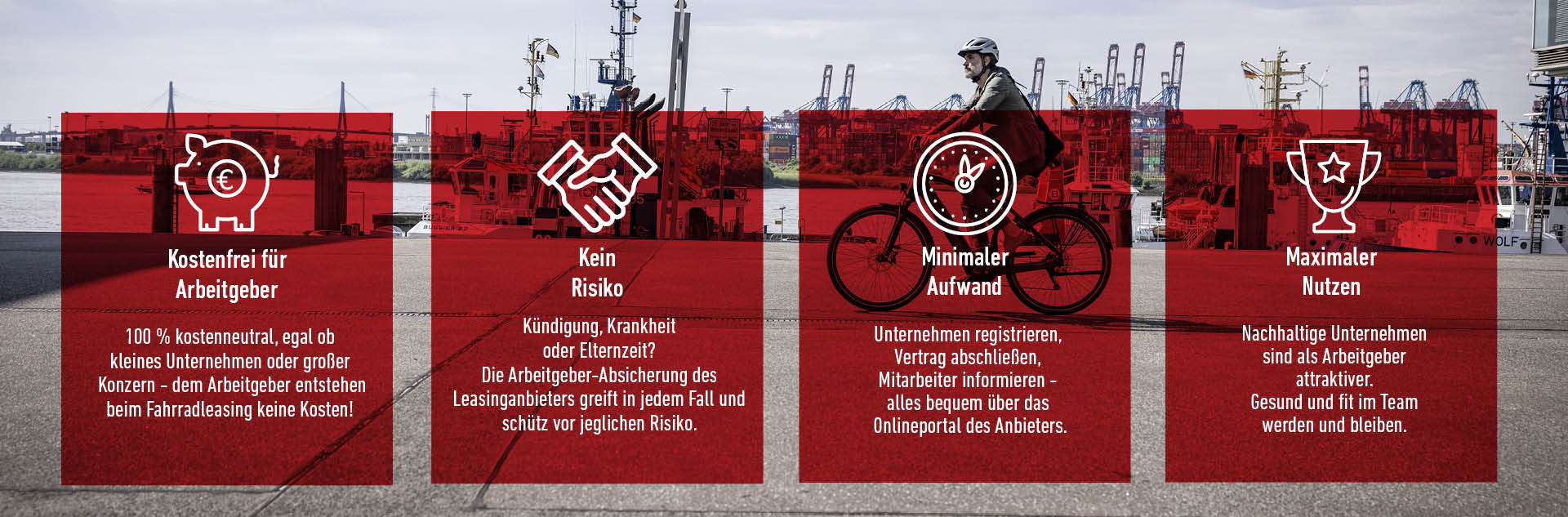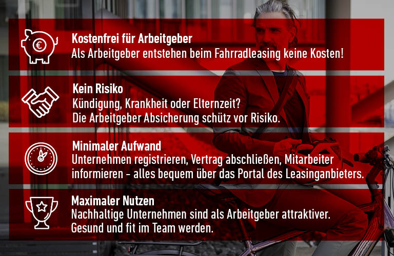 Bikeleasing ist perfekt für Arbeitgeber, die mit einem innovativen Benefit Mitarbeiter binden möchten. Es überzeugt bei der Mitarbeitersuche, da Arbeitnehmer bis zu 40 % der Kosten sparen. Der Aufwand für Arbeitgeber ist gering, und sie sind bei Mitarbeiterausfällen vollständig abgesichert.